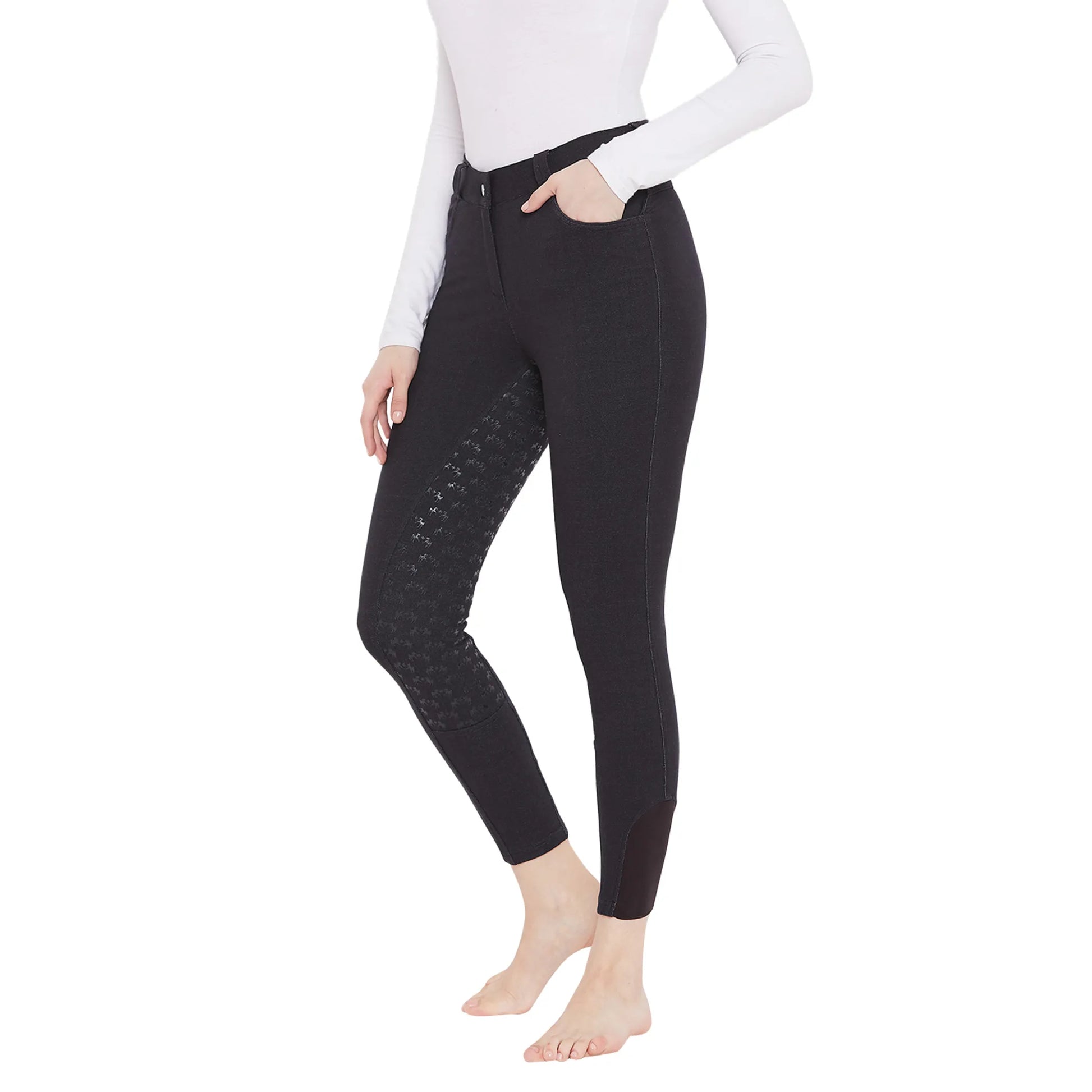 The Equine Couture Heather Full Seat Breeches are a blend of Cotton, Polyester, and Spandex. They are designed with easily accessible pockets and full seat coverage. There are 2 color options and a variety of sizes to choose from. The silicone print seat assures that the rider will have a good grip on the saddle.