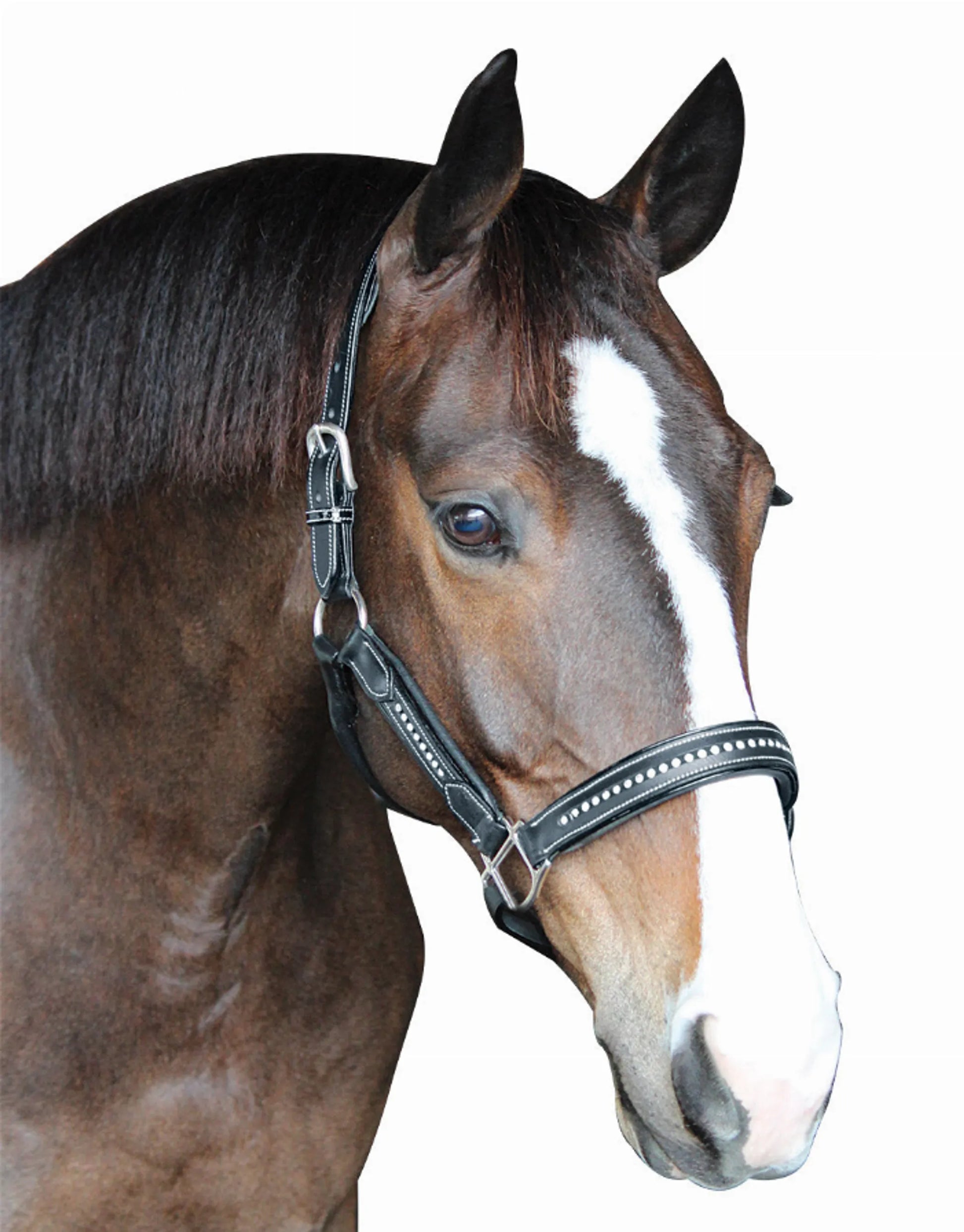 Steal the spotlight with the Henri de Rivel Padded Crystal Halter made from soft, imported leather coupled with sparkling crystal additions. Offered in 2 color options, this bedazzled halter features lovely crystal inlay on the nose and cheeks. Additional design details include a rolled throat, stylish patent leather piping, as well as a wide stitched crown piece for your horses's comfort.