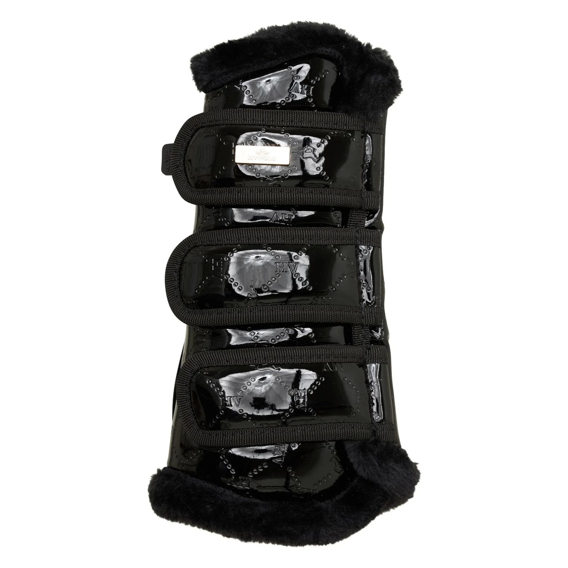 Classic dressageboots with faux fur edges and metal plate at top closure strap.