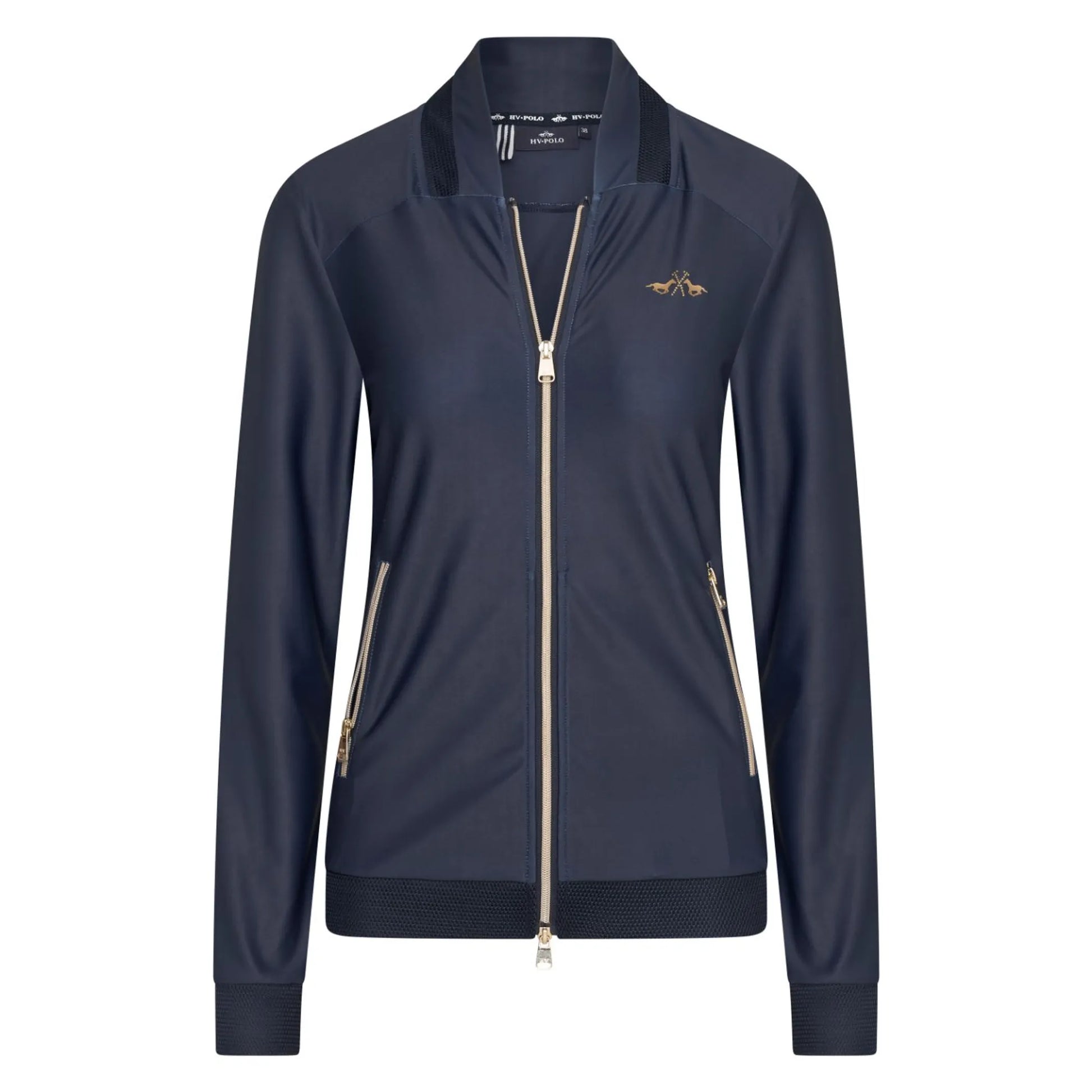 * Tech jersey in 4 way stretch * 2-Way zipper closure at front * Zipper pockets * Fashionable turtle collar with spacer mesh insert * Elasticated tape with silicone logo on cuffs and hem * Logo on chest with rhine stones