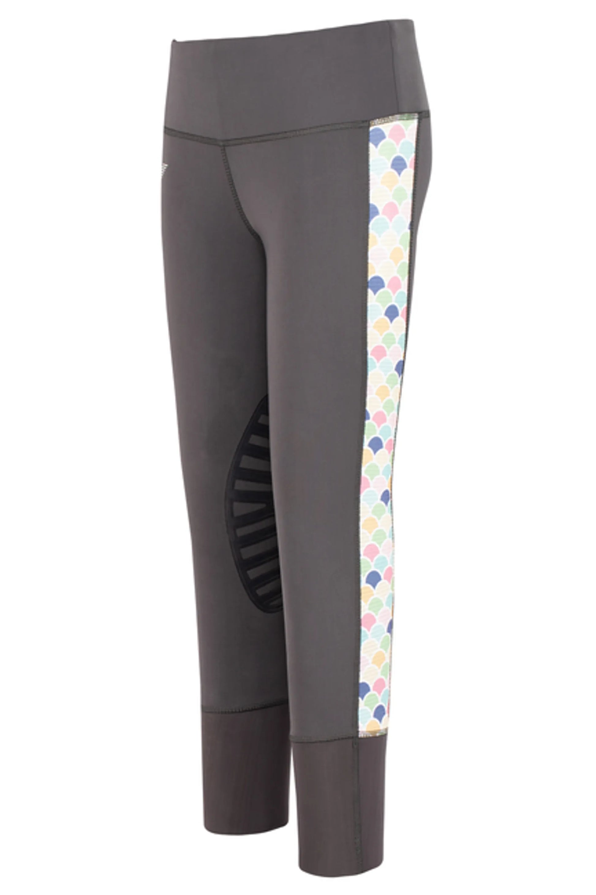TuffRider Children's Iris EquiCool Riding Tights are made with moisture wicking technical fabric that also has a UPF 50 sun protection rating. Sure to be a favorite during the warmer months this tight is manufactured with a side strip that allows for ventilation. The side strip features a beautiful and colorful scale pattern that is sure to make your young rider stand-out from the crowd. Ideal for schooling, these pull-on tights have silicone knee patches that prevent riding up and contoured sock bottoms to suit any leg length. Also included is a new zipper back pocket on the waistband which is perfect for treats!