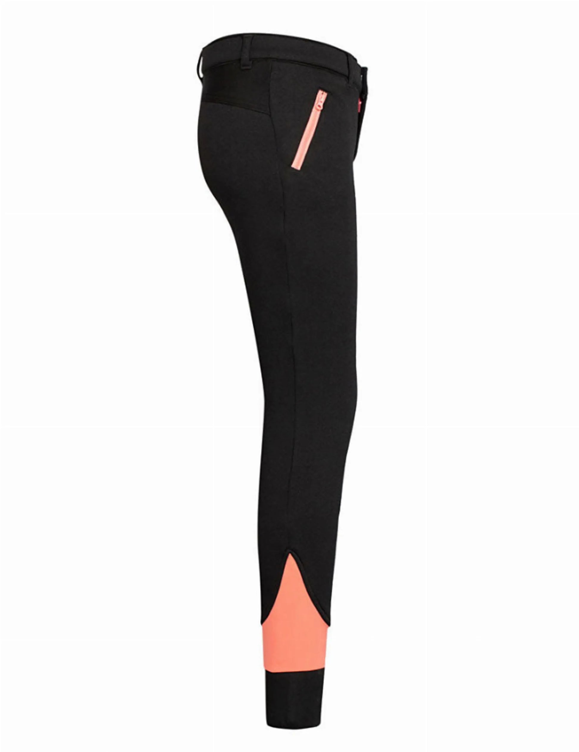Children's Macy Winter Breeches are styled with comfort and performance in mind. These winter breeches include faux fleece lining on the inside for a soft, warm feel and a polyester/spandex mix for freedom of movement and adequate stretch. These breeches feature stylish touches such as the silicone seat in a horseshoe pattern and the contrasting peach color on the pockets and sock bottoms. The Macy Winter Breeches are ideal for cute winter time riding! Care Instructions: Turn inside out and wash with warm water (medium temperature) and mild detergent. Tumble dry low, no bleach, must wash separately
