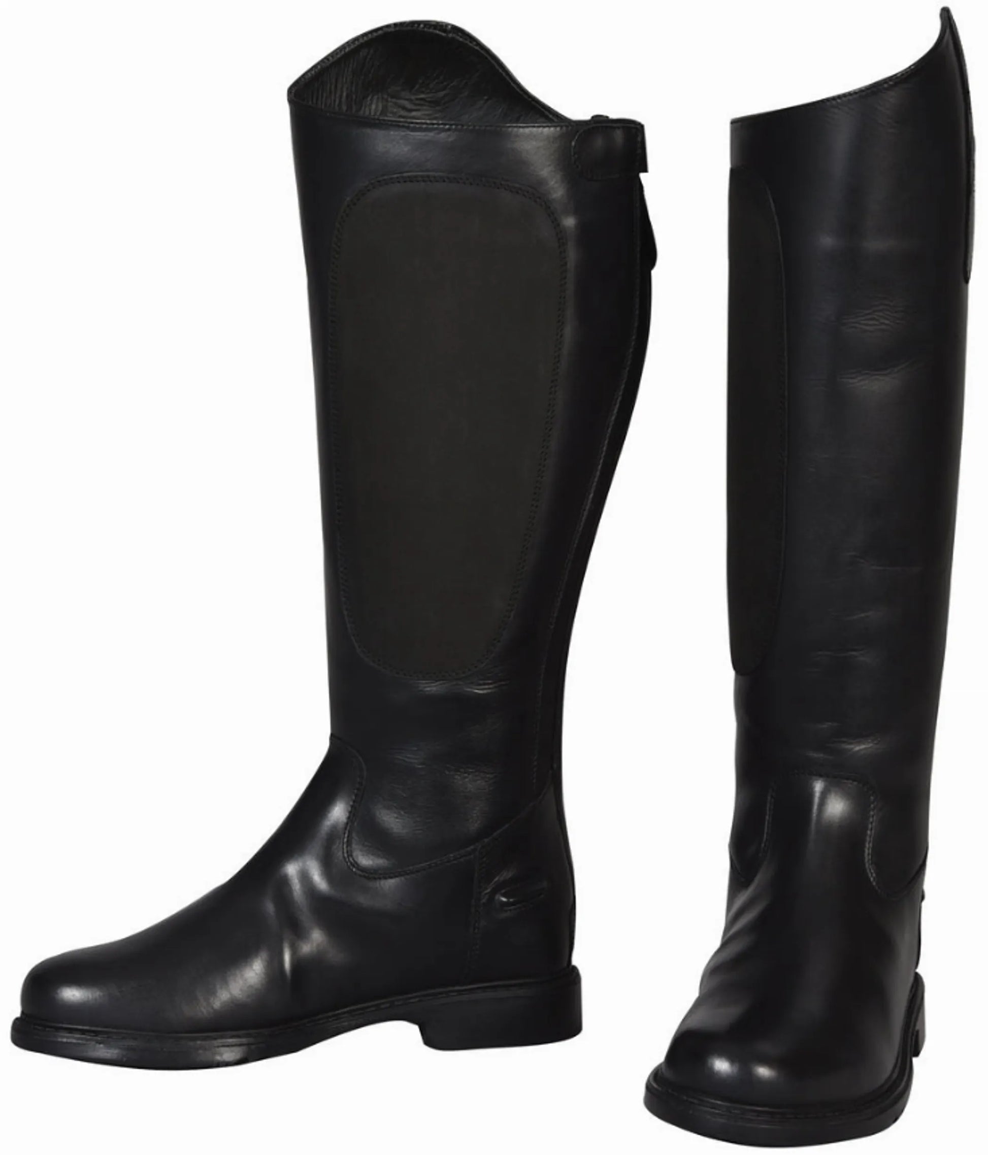 TuffRider Ladies Plus Rider Dress Boots are leather plus size riding boots that feature a wider calf with two stretchable elastic gussets on either side of the zipper, so every rider can find the perfect fit! These attractive boots are designed with a Spanish top, rounded toes, mesh lining, and memory foam footbeds, offering both comfort and style.